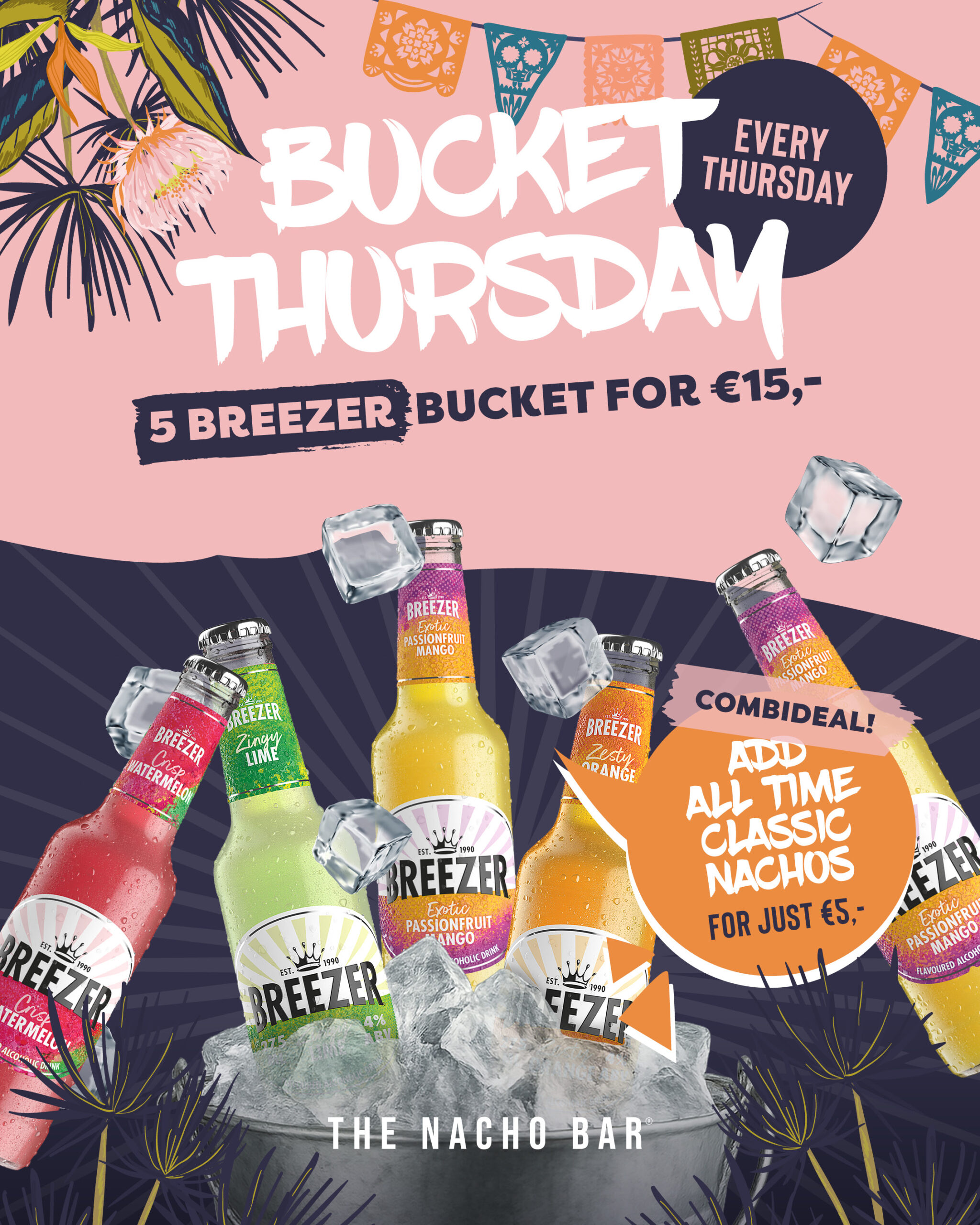 Bucket 5 Breezers (incl. Hawaii-ketting) + All Tine Classic Nacho voor 25,-